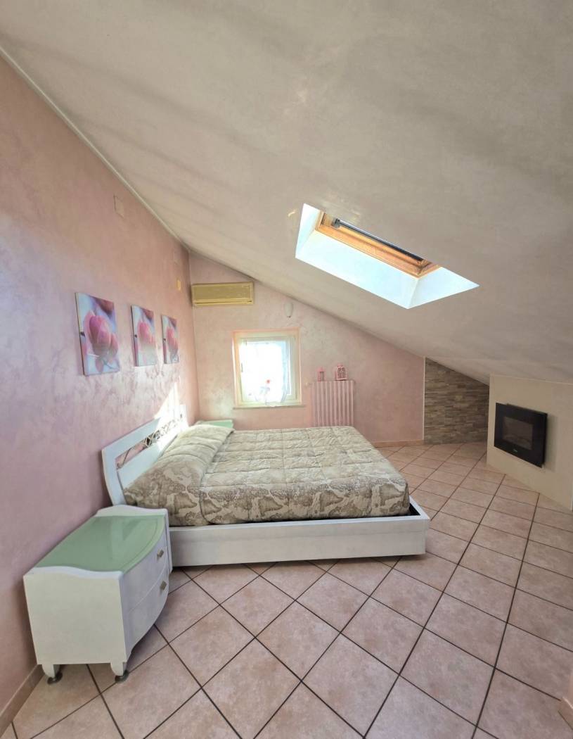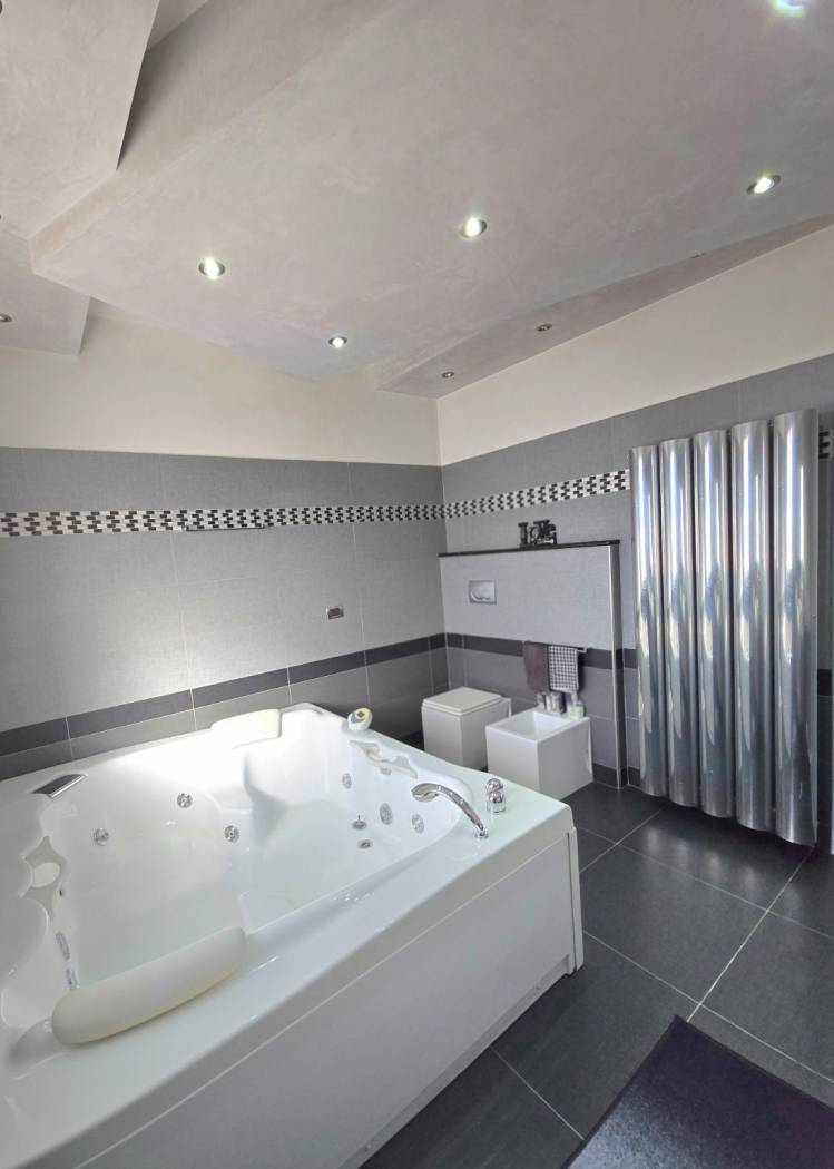 Al piano superiore, la zona living è spaziosa e luminosa, con una cucina abitabile e un salone che si affaccia su un terrazzo. Il bagno è un vero angolo di paradiso, dotato di una Jacuzzi per due persone. La camera degli armadi offre ampio spazio per organizzare al meglio i propri effetti personali. Non mancano due camere da letto al piano notte, un secondo bagno.